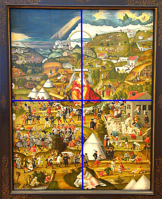 Alle Bilder sind jeweils mit den größeren Bildern meiner Seite verlinkt, so dass man sich dort Details besser anschauen kann. Teilt man Gerungs Bild in Viertel ein, lassen sich drei der Viertel - sehr oberflächlich - einem Planetenkinderbild zuweisen. Das linke untere Viertel zeigt vor allem Kampf- und Glückspiele, das wäre der Bereich des Sol. Diese Spiele ziehen sich so, dass sie dort fast die Hälfte ausmachen, ins rechte untere Viertel, das des Freudenhauses wegen von der Venus bestimmt erscheint. Auch ins linke obere Viertel ragen die Spiele mit dem Gewehrschießen noch hinein; ansonsten wirkt dieses Viertel auffallend düster und scheint auch im Zeichen von Mars zu stehen; allerdings kommt die Grausamkeit des Krieges, die auf den Planetenkinderbildern immer wieder thematisiert wird (vgl. u. a. die Tübinger Handschrift oder Muller im Detail), hier nicht zum Ausdruck. Die größten Schwierigkeiten entstehen beim rechten oberen Viertel, hier versuchsweise mit Saturn gefüllt, weil hier die Hinrichtung gezeigt wird, weil eine ferne Verbindung bei der Armenspeisung des Planetenbildes mit der Brotverteilung bei Gerung besteht und weil anderswo (z. B. bei de Passe) Saturn mit dem Bergwerk deutlich verbunden wird. Und diese Bemühung zeigt schon, in welche Richtung der Vergleich geht: Es bestehen natürlich thematische Verbindungen zwischen dem Gerung-Bild und den Planetenkinderbildern, das Gerung-Bild ist aber kein solches. |
