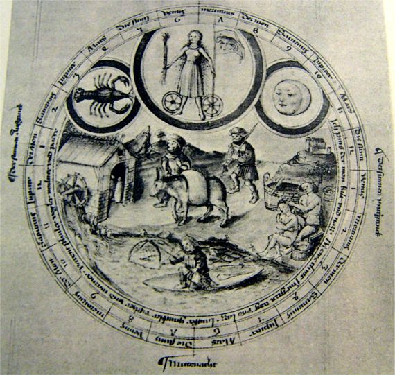 "Endlich Luna, ein hübsches, herangewachsenes Mädchen mit einem prall sitzenden Leibchen und einem nicht einmal bis zu den Knieen gehenden Röckchen. Rechts hat sie die mehrmals gebundene Fackel, links die Fahne mit einem Tier darauf; neben den Füßen die Räder. An Stelle des zweiten Hauses ist das Vollmondgesicht beigegeben. Auf der Erde die Mühle und der ihr zu getriebene beladene Esel. Ein Fischer fährt im Kahn, mit der Reuse an der Stange. Zum Schluss sehen wir noch eine Badeszene: neben einer großen Kufe wäscht ein Badeknecht, der nur eine Badehose trägt, dem aus dem Wasser gestiegenen Adam noch den Kopf." |