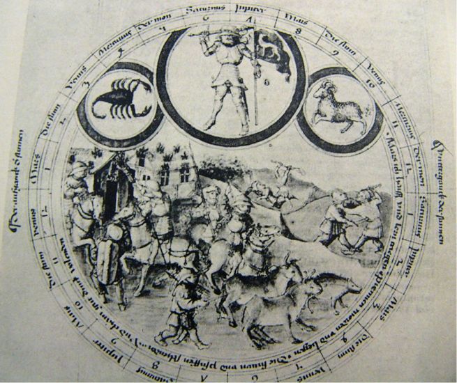 "Mars, der eiserne Ritter, hält das Schwert hinter das behelmte Haupt; auf der Fahne ein windhundartiges Tier. Unten der Krieg mit Raub, Totschlag und Brandlegung." |