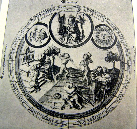 aus: "Die Bilder sind in ein Rund komponiert; oben in kleinere Kreise der Planet und je daneben seine Häuser. Die Menschen sind ziemlich geschleckt, etwas theatermäßig aufgeputzt und herausstaffiert wiedergegeben. Ihr Gesichtstypus ist übertrieben eckig, ähnlich der russischen Art. Sie machen einen zum Teil gaunerhaften, zum Teil stumpfsinnigen Eindruck. Die Bilder sind im Gegensatz zu anderen sehr anständig und dezent gehalten, nicht bloß das der Venus. Nackte Figuren kommen gar nicht vor; auch die Planeten sind bekleidet." Die Beschreibungen der einzelnen Bilder stammen ebenfalls von Hauber. SOL (S. 106f.) "Sol, fast die gleiche Gestalt wie der Richter auf dem Jupiterbild; ältere Figur mit dichtem, rotem Bart auf mächtigem Throne sitzend, in reichem Gewand und mit hoher Krone, in der Rechten das offene Buch, links die Fahne mit einem Bären (?) darauf. An Stelle des zweiten Planetenhauses ist das flammende Sonnengesicht angebracht. Auf der Erde Ringen, Schirmen, Steinstoßen, drei Andächtige vor dem Altar, und, was neu ist, etwas abseits zwei, die von einem Notenblatt singen." |