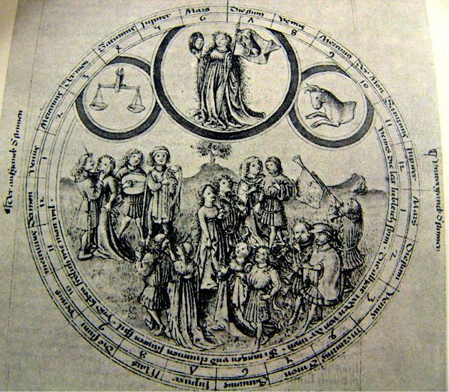 "Venus, eine Matrone in vornehmem Gewande, rechts einen gewölbten Spiegel, links die Fahne mit einem Tier (Affe?) darauf, das vielleicht ebenfalls einen Spiegel hält. Die Venuskinder lieben einander in gemessenen Grenzen und erheitern sich mit Musik und Tanz. Ein Bläser hat einen Adler mit ausgebreiteten Fängen auf seinem Wappentuch. Unter 15 Personen sind 5 Musikanten." |