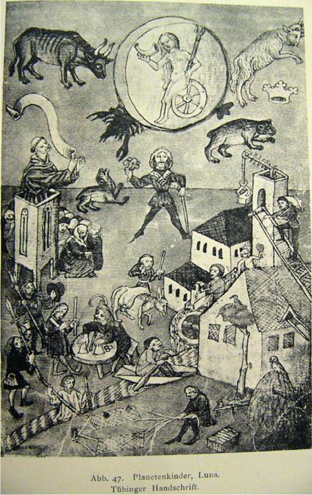 "Luna (Blatt 271 v) Luna der Mone ist der nyderste planete und uns aller neste und leuft durch die 12 zeichen in 27 tagen und ist in eym iglichen zeichen 2 tage 6 stunden 38 mynuten und hat grossen gewalt in dem wieder, want er ist sin erhounge <sic!> und hat noch großern gewalt in dem krebs, wan er ist sin huß und hat unglucke und wenig gewalts in dem tarrant <Anmerkung Haubers: "Darrant, tarant (tarr ..), Skorpion, Tarantel."> und in dem steynbocke. Der mone ist uns zugefuget alles gestyrnes und aller planeten influße, want er uns allernest ist mit synem lauf aller snellichste. Myn kint ist unstede als der Mone und blibet selten an eyner stat und fahet vil an, er ist lugenhaftig, wiser rede, kalter nature, lichtlich ungesunt, umb cleyne ding zornig und ungemut und wirt selten 60 jar alt, und ist gern eyn kaufman eyn schiffman ein leufer oder bote. Sin antlitz ist rünt bleich und clare, sin styrne breit, eyn auge grosser dan das ander nyder nase mit wyten naselochern, eyn dicken münt, sin antlitz hat dicke zeichen und wirt bezitlich gra und hat selten glucke." (Luna,