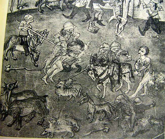 In der Mitte hat ein Ritter einen nur mit einem Hemd Bekleideten, der die Schwurfinger emporhebt, um seine Unschuld zu beteuern, zu Boden geworfen und bearbeitet ihn mit dem Schwert; ein heranreitender weiterer Gewappneter bedrängt den armen Teufel noch von hinten mit seinem Spieß. Ein anderer Reisiger führt einen Gefangenen im Hemde fort, den sein Weib zurückzuhalten sucht. Weitere Helfershelfer zu Fuß und zu Pferde treiben Rindvieh, Schweine, Schafe, Pferde, Hunde fort. |