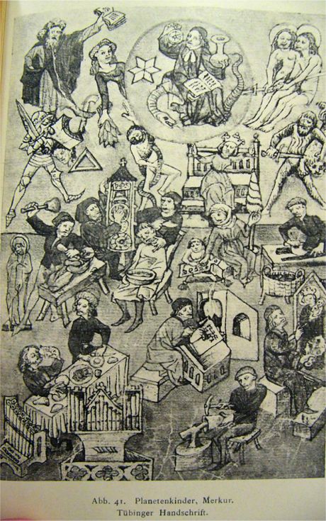 "Merkur Blatt 270 v). Mercurius ist under Venus allerneste und hat grossen gewalt in dem zwylinge, wan das ist sin huß und hat noch grossern gewalt und glucke in der junffrauwen, want sie ist sin erhohunge und hat keynen gewalt in dein <sic!> schutzen noch in dem fische. Mercurius ist gut by den guten und bose mit den bosen und ist doch gut von syner naturen. Syn kynt ist wolgespreche und meisterlich und rümet sich gern und fraget gern nach grossen sachen und künsten und ist eyn meister siner reden und hubscher fremder kunste bisunder in den sachen, dar inne man kunftige dinge befindet und in allen naturlichen sachen und eyn meister hubscher reden und dichtens und grosser rechenongen, snytzen, graben, malen, urgelmachen, sie hant (!) wunderlich betrachtunge uf die kunst und eynen unmüssigen synne und begriffet an leren was er will und behelt es lange und ist unstede und bewegelich und wandert gern in fremde lant. Syn stirn ist breit, sin brawen lang, syn augen swarz, sin nase slecht, syn antlitz clare bleich, sin lefzen groß, syn zende glych, sin kynne gespalten, syn finger lang; er achtet nit vil uf frauwen und treit gern grawes gewant und hat vil fründe und auch zu keynem glucke. Und hat lange beyn und etliche sagen, er habe eynen langen halß und eyn geringes gemute und eyn dynne har und ist unstete." (Merkur
