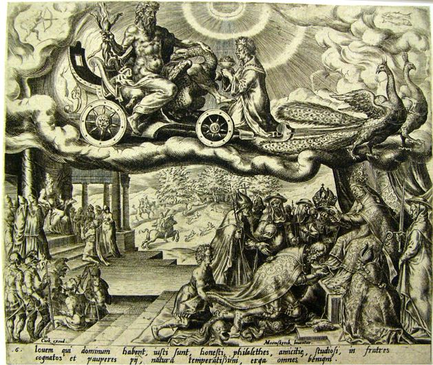 Iovem qui dominum habent, iusti sunt, honesti, philalethes, amicitiae (,) studiosi, in fratres cognatos et pauperes pii, natura temperatissimi, erga omnes benigni. Übersetzung: "Die Jupiter als Herrn haben, sind gerecht, ehrenhaft, wahrheitsliebend, um Freundschaft bemüht, sich ihrer Verpflichtung gegen die blutsverwandten Brüder und die Armen bewußt, von Natur äußerst maßvoll, gegen alle wohltätig." Quelle: Katalog der Ausstellung "Der Welt Lauf", Stuttgart 1997 |