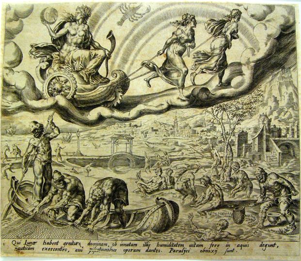 Qui Luna(m) habent geniturae dominam, ob innatam illis humiditatem vitam fere in aquis degunt, nauticam exercentes, aut piscationibus operam dantes. Paralysi obnoxii sunt. Übersetzung: "Die als Herrin ihrer Geburtsstunde Luna haben, verbringen wegen der ihnen angeborenen feuchten Beschaffenheit das Leben in der Regel auf dem Wasser und fahren zur See oder verwenden ihre Arbeitskraft aufs Fischen. Der Gicht sind sie preisgegeben." Quelle: Katalog der Ausstellung "Der Welt Lauf", Stuttgart 1997 |