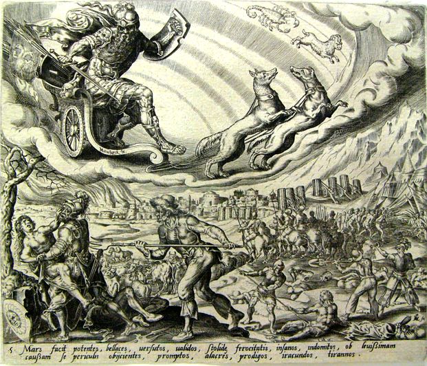 Mars facit potentes, bellaces, versutos, validos, stolidae ferocitatis, insanos, indomitos, ob levissimam caussam se periculis obiicientes, promptos, alacres, prodigos, iracundos, tirannos. Übersetzung: "Mars bringt die Mächtigen, Kriegerischen, Gerissenen, Starken hervor, die von einfältiger Kampfeswut sind, die Rasenden, Unbezähmbaren, die sich auf leiseste Veranlassung in die Gefahr stürzen, die schnell zur Hand sind, die Feurigen, Verschwenderischen, Aufbrausenden, die Gewaltherrscher." Quelle: Katalog der Ausstellung "Der Welt Lauf", Stuttgart 1997 |