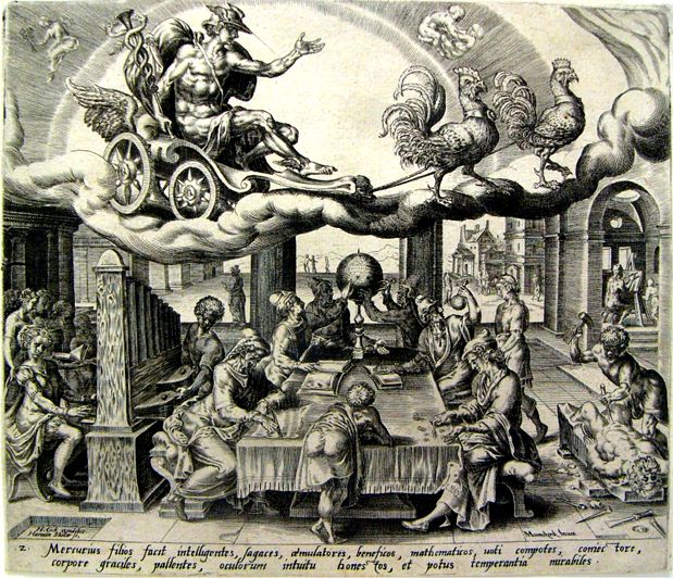 Mercurius filios facit intelligentes, sagaces, aemulatores, beneficos, mathematicos, voti compotes, coniectore(s), corpore graciles, pallentes, oculorum intuitu honestos, et potus temperantia mirabiles. Übersetzung: "Merkur macht seine Söhne zu verständig (sic!), gewitzt, zu Nacheiferern, Wohltätern, Mathematikern, (zu Leuten,) die das Ziel ihrer Wünsche erreichen, zu Traumdeutern, zu schlank gebauten, blassen, dem Augenschein nach ehrenhaften und im Trinken erstaunlich enthaltsamen (Menschen):" Quelle: Katalog der Ausstellung "Der Welt Lauf", Stuttgart 1997 |