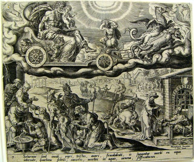 Saturnini sunt invidi, pigri, tristes, avari, fraudulenti, is sequuntur morbi ex aqua intercute, quartana febris, carceres, mortes in aquis, venena, suffocationes. Übersetzung: "Saturnsprößlinge sind neidisch, faul, finster, habgierig, betrügerisch; ihnen folgen Wassersucht, Quartanfieber, Kerker, Tod im Wasser, Gift und Ersticken." Quelle: Katalog der Ausstellung "Der Welt Lauf", Stuttgart 1997 |
