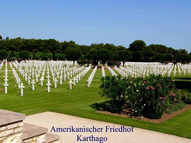Von Bordj-Cedria kann man, wie das vorausgegangene Bild zeigt, über die Bucht von Tunis hinüberschauen nach Karthago, in dessen Ortsgebiet der hier gezeigte Amerikanische Soldatenfriedhof liegt. Ich habe ihn als Kontrast hinsichtlich der Grabanlage, aber als Ergänzung für den Beitrag menschlichen Leids in die Seiten von Bordj-Cedria aufgenommen. |