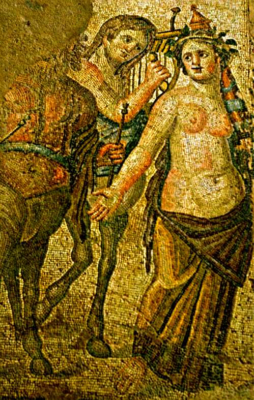 Dieser Kentaur und die Mänade stammen aus dem linken unteren Bildfeld aus dem Haus des Aion in Paphos. Das Bildfeld stellt den Triumph des Dionysos dar. Das Haus des Aion ist eines der Häuser mit den schönen Mosaiken von Paphos.
