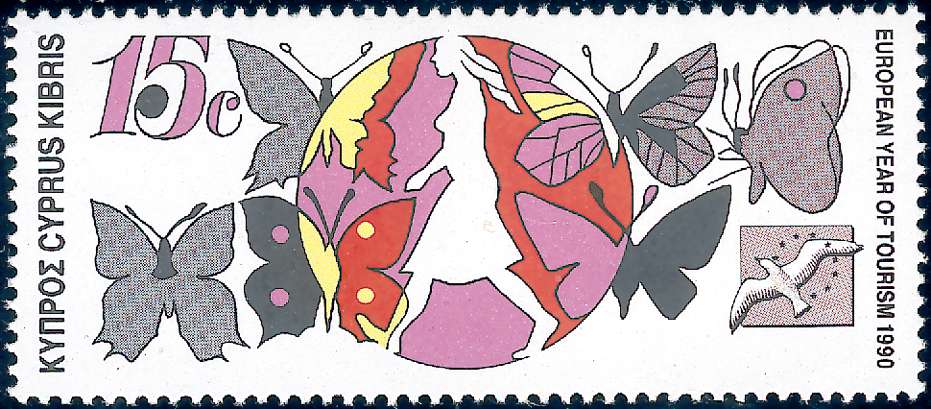 Die beiden höheren Werte dieser Serie hat Antis Ioannides mit Symbolen des Umweltschutzes gestaltet: Auf dieser Marke steht im Zentrum die Frau umgeben von verschiedenen Schmetterlingen.