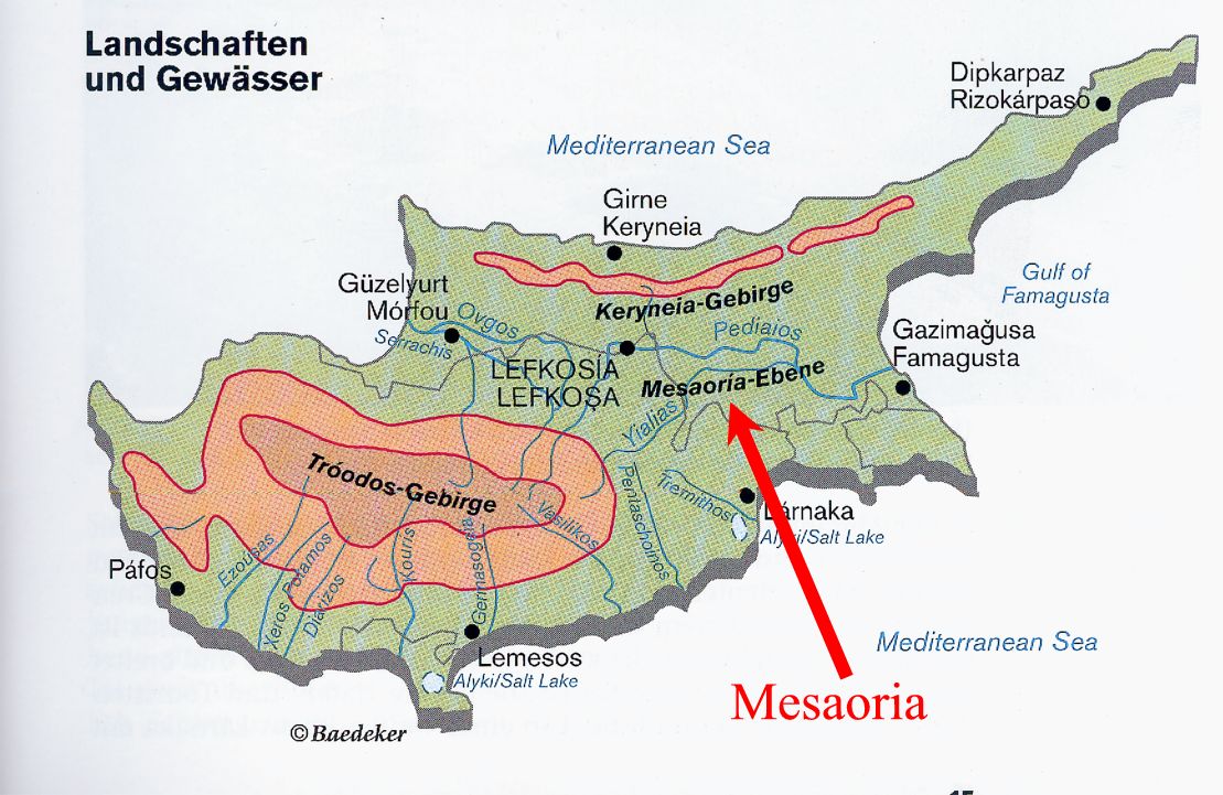 über dem Meeresspiegel). Südlich davon erstreckt sich eine weite Ebene (Mesaoria),