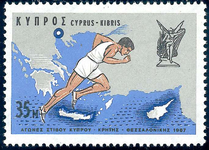Landkarte des Ägäischen und Kretischen Meeres mit eingezeichneten Teilnahmeplätzen; Emblem (Göttin Nike des Taionios)