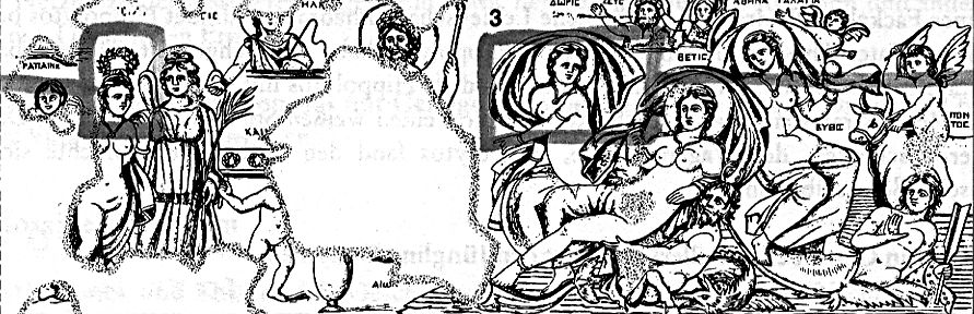 ihre Beischriften klar erkennbar: Links, mit dem blauen Mantel, schaut Doris, die Mutter der Nereiden auf ihre beiden Töchter