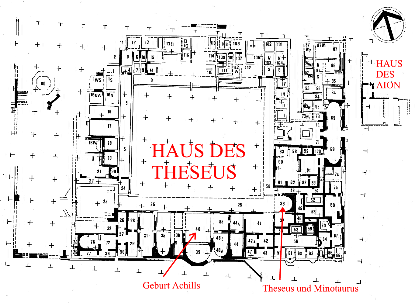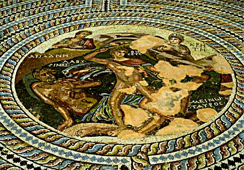 Das Haus des Theseus wurde im 2. Jahrhundert nach Christi Geburt errichtet. Sämtliche figuralen Mosaiken befinden sich im Südteil des Komplexes (in der Zeichnung also unten). Das Theseus-Mosaik wurde im apsidialen Raum Nr. 36 gefunden, der am Ostende der Hauptportikus liegt. Es entstand vermutlich im späten 3. Jahrhundert nach Christus. In einem Medaillon, das von labyrinthartigen Ornamenten umgeben ist, befinden sich fünf namentlich gekennzeichnete Gestalten. Im Zentrum befindet sich Theseus, der wohl den Minotaurus schon besiegt hat, denn dieser liegt rechts vor ihm; man erkennt das linke Bein samt Fuß von Minotaurus, Theseus steht seinerseits mit dem rechten Fuß darauf. Das Geschehen verfolgt von links oben Ariadne, die Schwester des Minotaurus, die dem Theseus ja den berühmten Faden anvertraut hatte. In der anderen Diagonalen von links unten nach rechts oben befinden sich zwei Allegorien, die den Ort vermitteln: links unten "Labyrinthos", das Labyrinth, in dem Theseus den Minotaurus erlegt hat, und rechts oben die Personifikation des Landes, in dem sich alles abspielte: Kreta. Aus diesem Mosaik wurden zwei Motive für Briefmarken verwendet: Ein weiteres Mosaik aus dem Haus des Theseus, das auf der Freimarkenserie von 1989 bedacht wurde, stammt aus dem Umfeld des Mosaiks von der Geburt des Achill. Es zeigt einen geflügelten Eros/Amor, mit Waffen, Sandalen und einen im Wind flatternden Mantel. Die Bildinschrift benennt ihn als "Cupido"; das ist ein Beiname von Eros/Amor. Eros [griechisch: »Liebe«], griechischer Gott der Liebe (römisch
