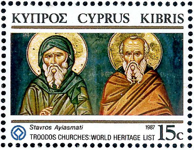 Briefmarke stellt die Heiligen Antonius und Sabbas dar. Diese beiden Heiligen