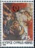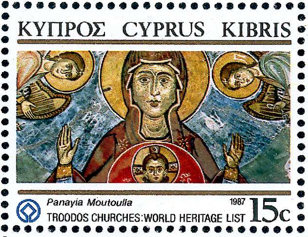 Briefmarke zeigt Maria mit dem Christusmedaillon zwischen den Erzengeln; das